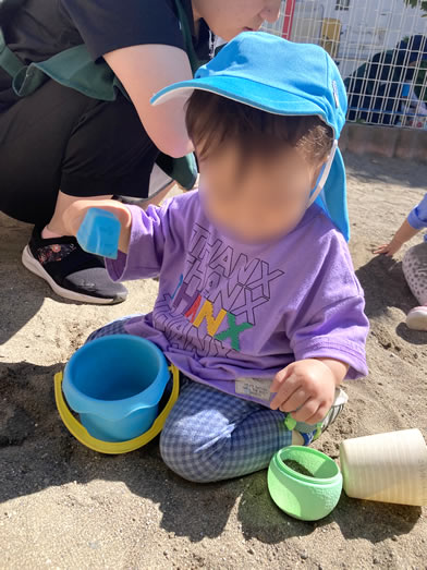 砂の感触にも慣れ、手で砂を掴んだり掴んだ砂を落としたりして楽しむ姿が見られるようになってきました。