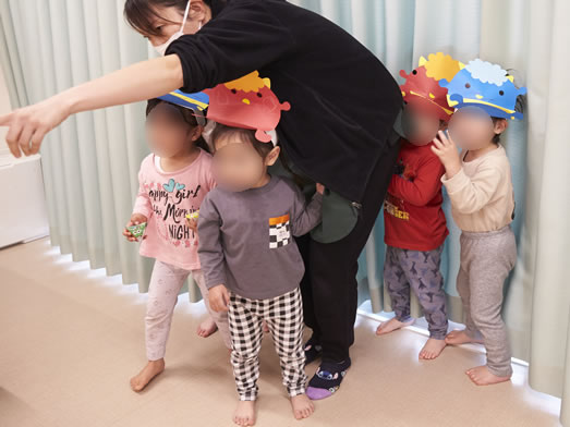 0歳児すみれ組と1歳児たんぽぽ組には鬼も気を遣ったのか、お部屋には入って来ませんでした(笑)