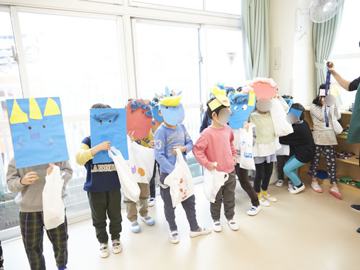 手作りのお面をかぶり、さくら組の子ども達も鬼を待ち構えていました★