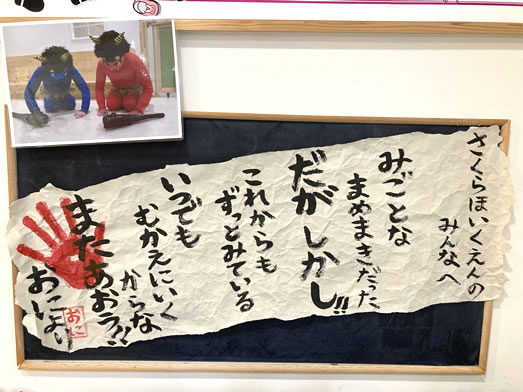 自分の中にいる泣き虫鬼・わがまま鬼・好き嫌い鬼・怒りんぼ鬼など、様々な鬼をやっつけたさくら保育園の子ども達!