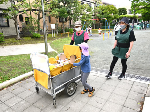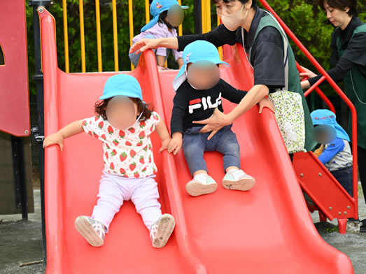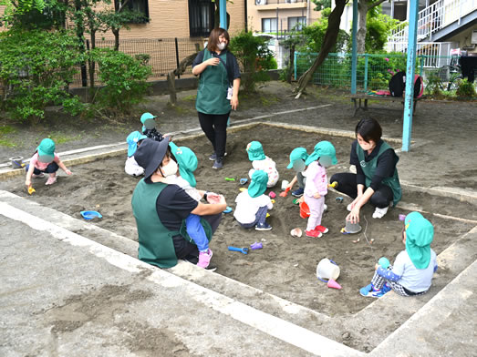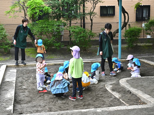 さくら保育園の近くにあるローラー公園がお気に入りの公園で、砂場遊びでは年上クラスのお友達とも異年齢交流しながら遊びます♪