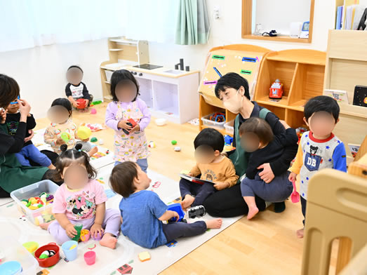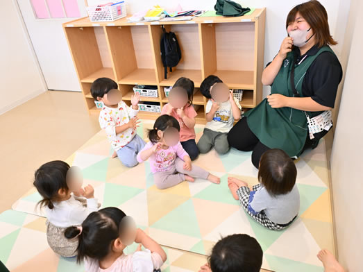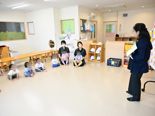 朝の会では絵本の読み聞かせを行ったり、みんなで手をつないで朝の歌を保育者と一緒に歌ったりしています。
