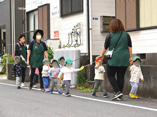散歩ロープをしっかりと握り、園と公園の往復の道を歩きます♪