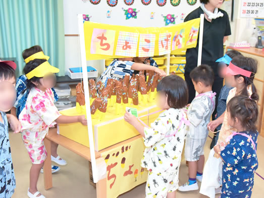 5歳児さくら組のお部屋では、いちごあめ・チョコバナナ・的当て屋さんがオープン♪