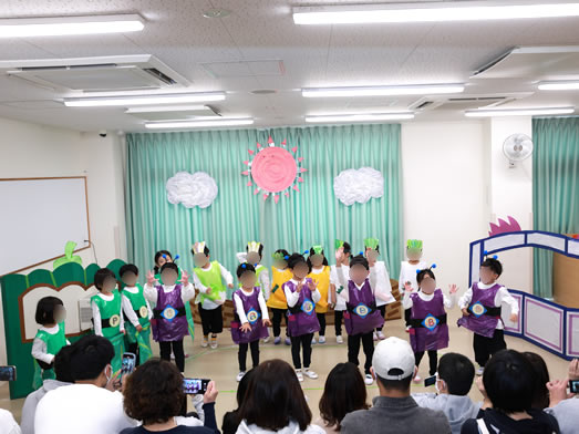 子ども達の大好きな絵本【ピーマンマン】を題材とした劇で、役ごとの台詞や歌、ダンスなど緊張しながらもばら組さんらしく元気いっぱい演じていました♪