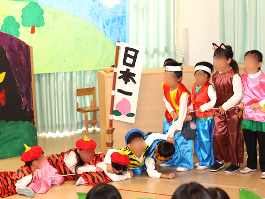 桃太郎の仲間は、きじの代わりにお月見うさぎが登場したり、いたずらな可愛い鬼達の中にはギャル鬼がいたり・・・子ども達は自分がなりたい役になりきって練習の時から本番まで終始楽しんでいましたよ♪